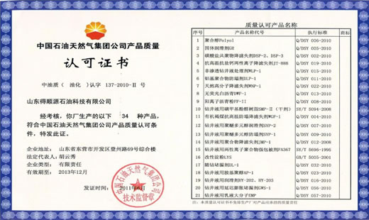 公司建立了先進完善的內控體系和質量控制體系,通過了API spec Q1及API 13A認證、ISO9001質量管理體系認證、14001環(huán)境體系認證、18001職業(yè)安全健康體系認證、HSE健康安全環(huán)保體系認證和CNPC油田化學劑質量認證。